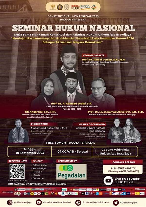 Menghadiri seminar hukum bisa jadi adalah salah satu cara paling efektif untuk memahami dunia hukum lebih dalam. Seminar hukum bukan hanya tentang duduk diam dan mendengarkan presentasi; ini adalah kesempatan emas untuk berinteraksi, bertanya, dan belajar secara aktif dari para ahli. Sebagai peserta, Anda berhak mendapatkan informasi terbaik dan terkini. Jadi, jangan sia-siakan kesempatan untuk bertanya dan berdiskusi ketika ada hal yang membingungkan atau menarik perhatian Anda. Dengan berbagai topik menarik seperti perlindungan hak cipta, hukum pidana, dan banyak lagi, sangat penting untuk memperhatikan setiap detail yang disampaikan.